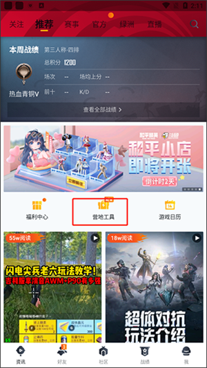 4、打开营地工具页面,即可找到游戏工具(即:对局工具,注意该工具需要当天登录营地,才能激活游戏内的工具功能)。
