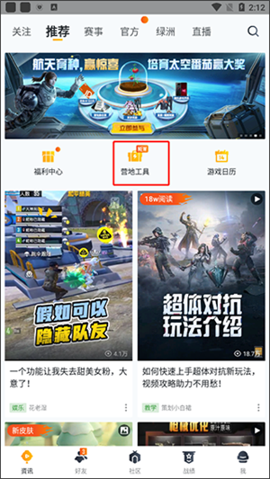 2、在资讯中找到营地工具,打开,进入游戏工具界面。