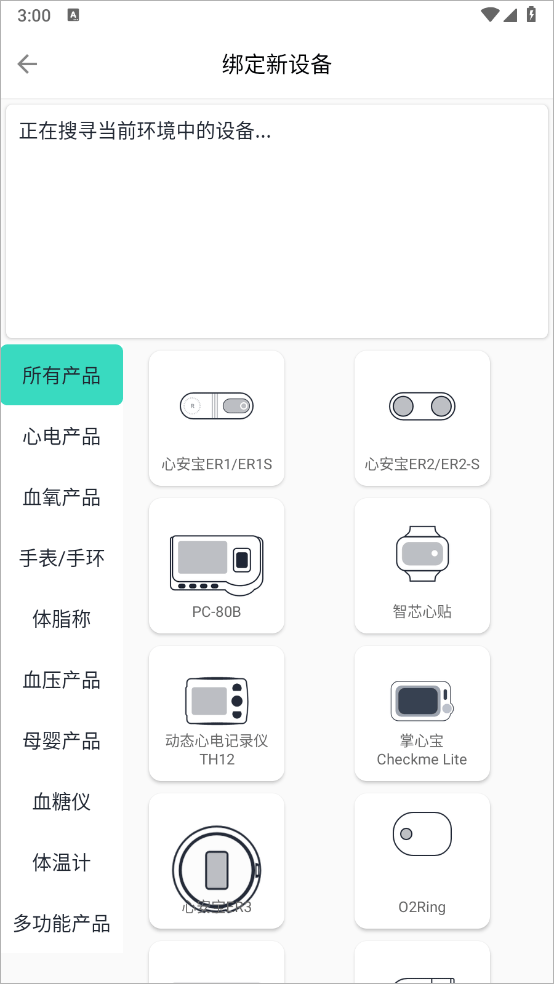 4、进入页面可以直接蓝牙搜索当前附近设备连接或直接选择产品类型