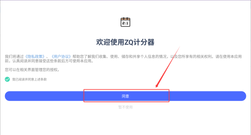 1、首次启动软件时,请阅读并点击同意用户协议,随后进入主界面。