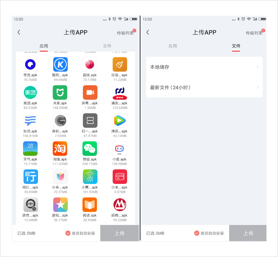 2、进入游戏上传功能界面,红手指云手机会自动检测手机内已有的APK文件并展示,也可以选择上传其他格式的文件。点击需要上传的文件,并勾选是否自动安装文件,点击“上传”按钮。