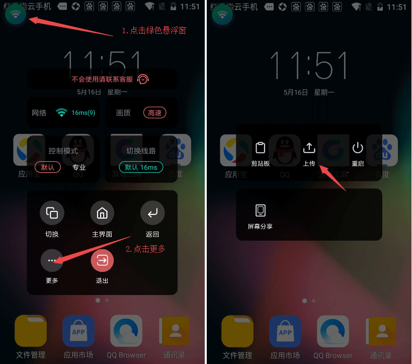 -进入红手指安卓版的虚拟云手机桌面,点击绿色悬浮功能窗,点击“更多”选择点击“上传”按钮,可以跳转至文件上传界面。