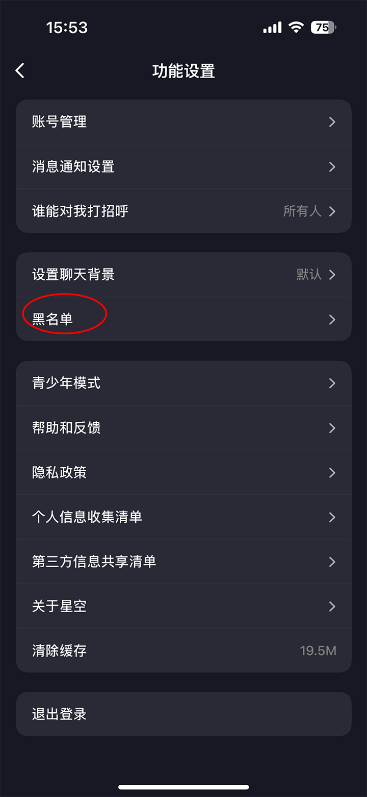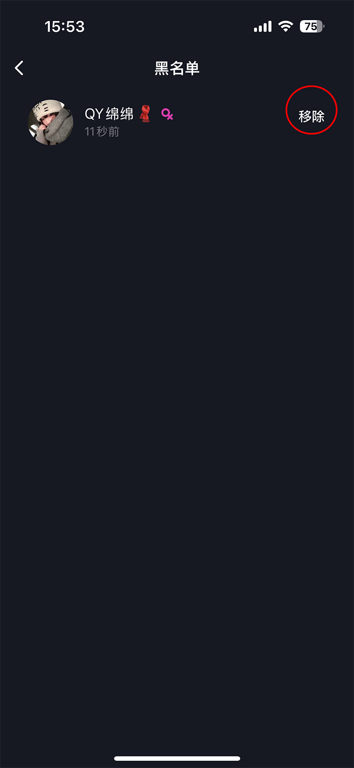 4、进入黑名单点击移出即可激昂用户移出黑名单