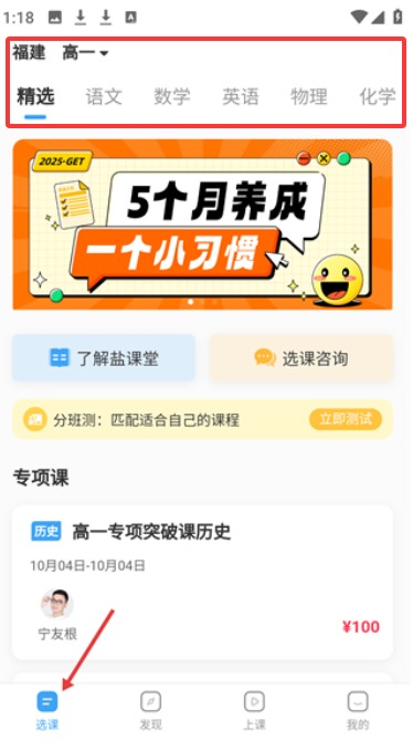 1、选课页面按学科分类展示课程资源,针对高一学段提供历史专项等系列教学内容。
