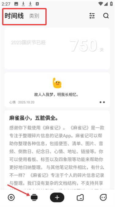 1、时间线页面可记录日常心情与碎片信息,自动显示重要日期的倒计时提醒功能。