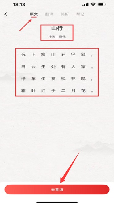 4、古诗详情页提供原文注释等学习资料,点击背诵按钮可进行记忆训练操作。