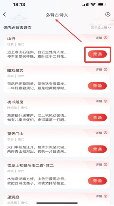 3、必背古诗文页面按学期分类展示课内诗词,每首诗均配有详情与背诵功能。