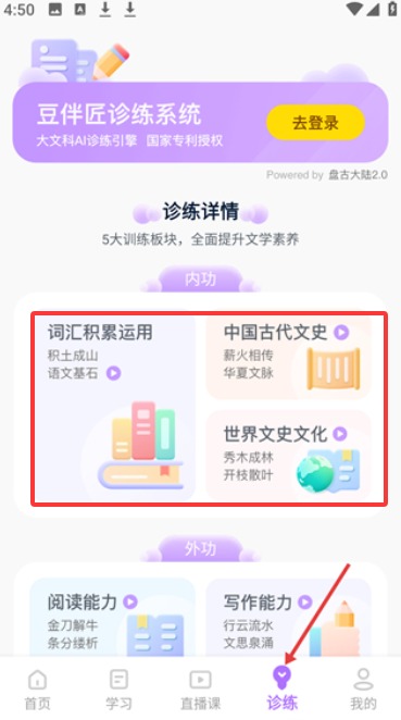 3、诊练系统依托AI技术开发词汇积累等训练模块,需登录后使用智能学习功能。