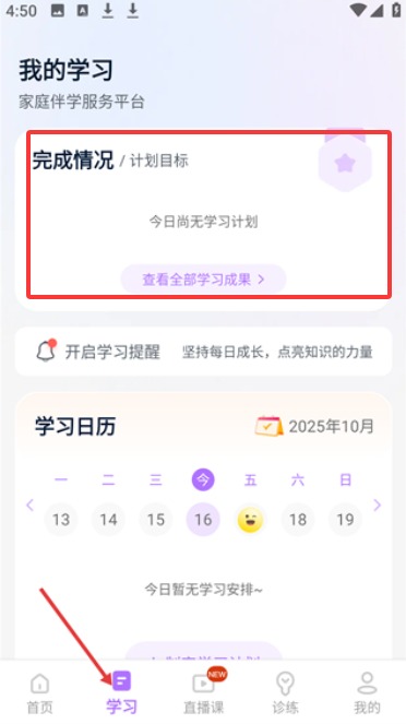 2、学习页面提供家庭伴学计划管理,支持学习提醒与日历视图等进度跟踪功能。