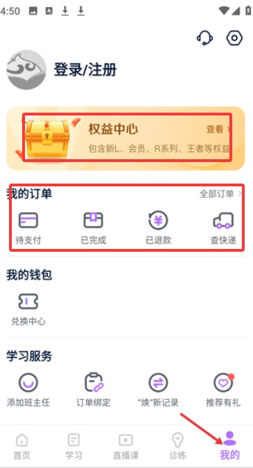 4、个人中心集成账户管理与权益服务,支持订单绑定等学习辅助功能配置。