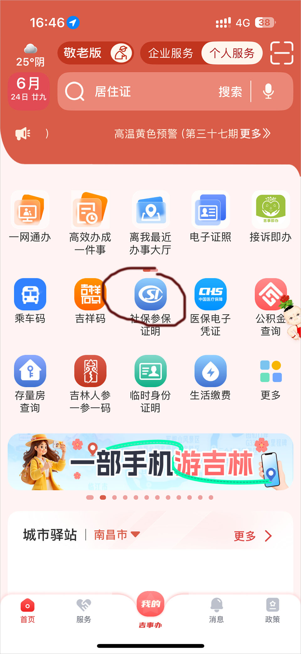 1、打开App,首页高频服务区提供“社保参保证明”服务快捷入口,点击图标即可办理。