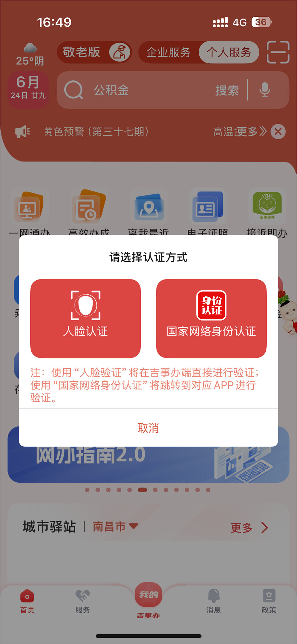 2、选择“人脸认证”方式进行身份认证。若选择“国家网络身份认证”方式进行验证,首次验证需要下载安装“国家网络身份认证”App,注册并绑定本人身份证。