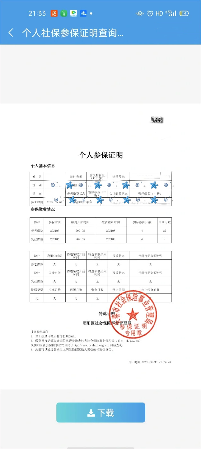 3、查看“社保参保证明”,安卓手机App长按“社保参保证明”选择“保存到文件夹”,即可将“社保参保证明”电子版保存到本地。