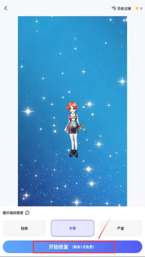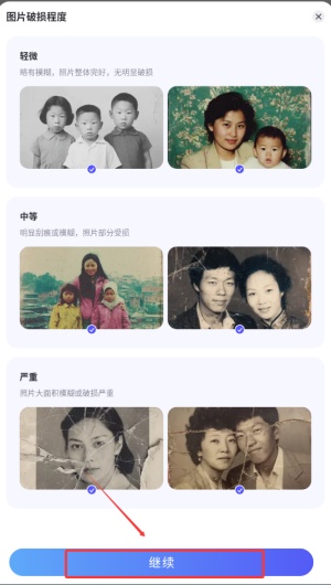 2、根据照片的模糊、划痕或褪色情况,评估其需要修复的具体程度点击继续。