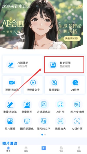 2、在应用首页中找到“智能抠图”选项,点击即可启动该功能。