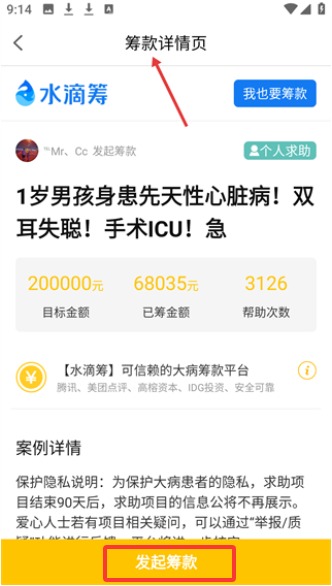 4、筹款页面公示求助项目进展详情,用户可查看具体案例或发起个人求助项目。