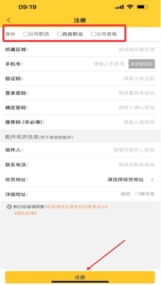 3、注册需选择技术员身份并填写区域信息,完善配件收货地址并同意服务协议。