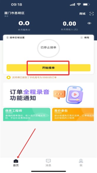 4、首页展示服务数据与预估收入,支持接单区域设置并集成订单录音功能。