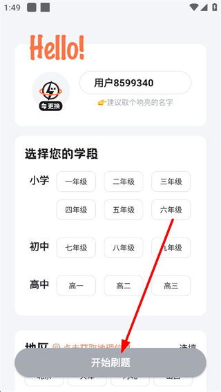 2、登录成功后选择对应学习阶段,涵盖小学至高中各年级,确认后即可开始刷题训练。