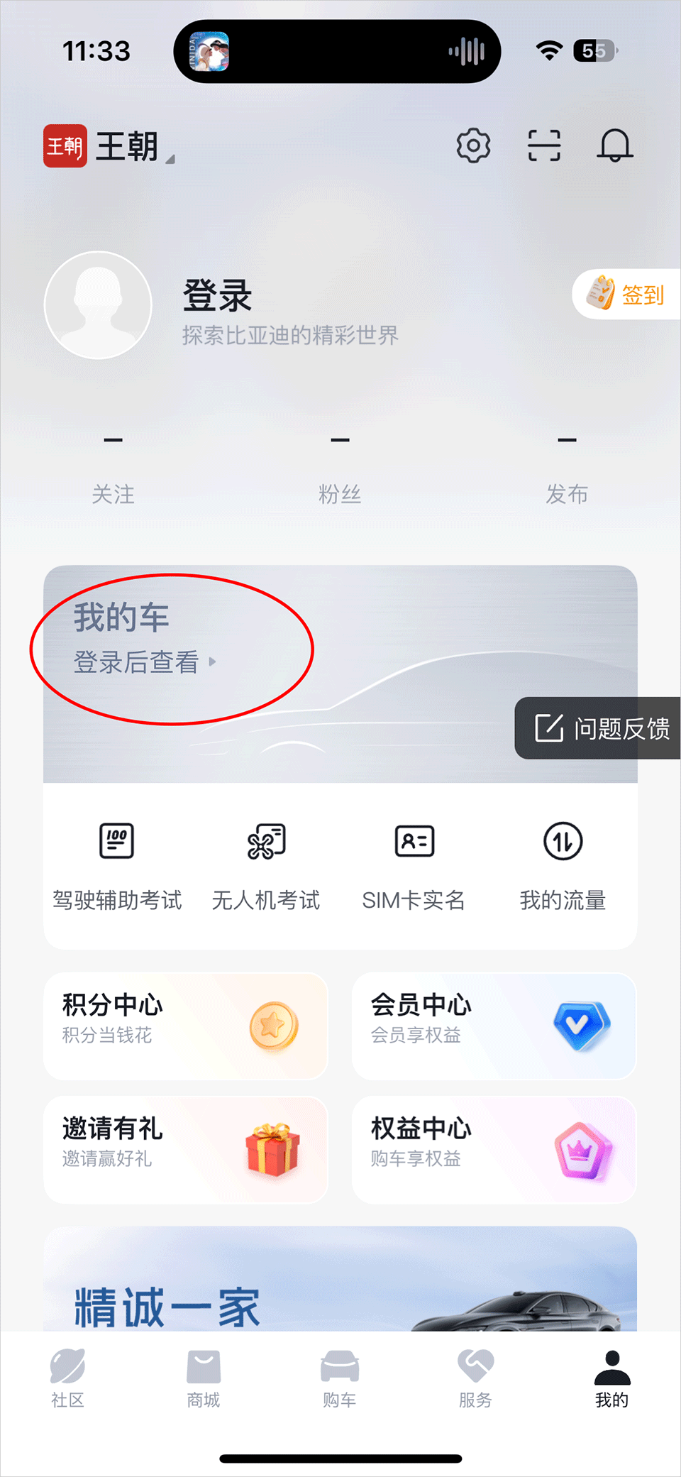 2、在跳转出的我的界面中,登录并点击“我的车”选项。