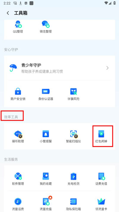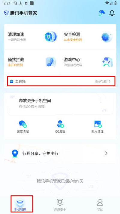 1、打开腾讯手机管家,进入界面,点在【工具箱】点击更多功能
