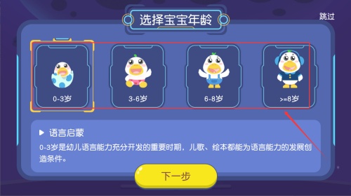 2、根据宝宝的实际成长阶段选择对应年龄,系统将据此智能匹配学习内容。