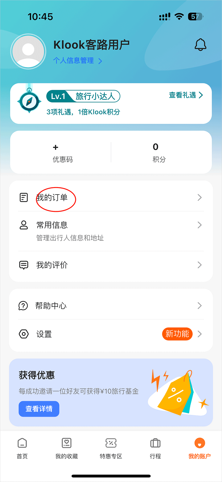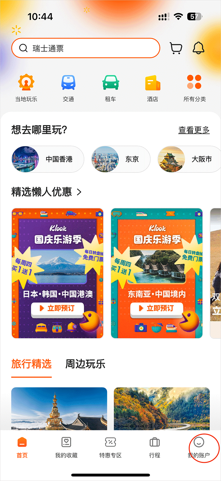 1、打开Klook客路旅行app官方版进入首页点击右下角我的栏目
