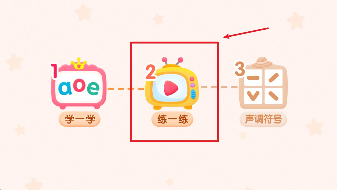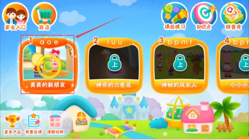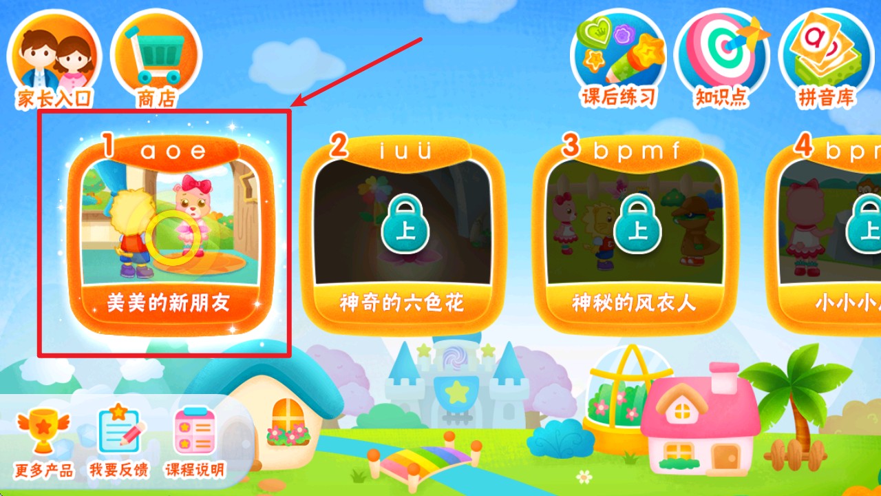1. 进入 App 后在主界面点击“美美的新朋友”课程图标,开始第一课的拼音学习。