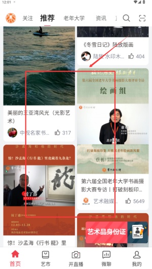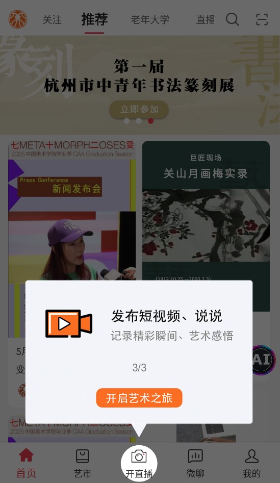 3、通过“开直播”按钮可发布短视频或开设直播,记录艺术灵感与创作瞬间。