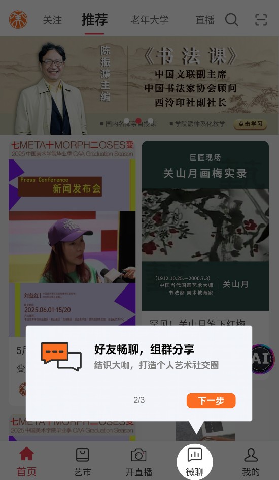 2、点击“微聊”可加入艺术群聊,与好友互动交流,打造专属的艺术社交圈。