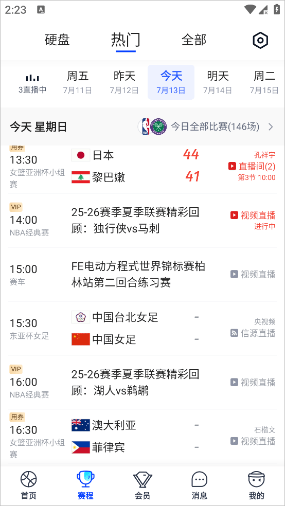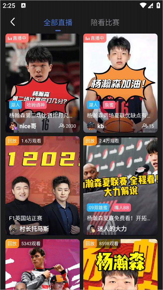 2、可以查看当前的所有直播以及直播回放,陪看比赛可以预约其他待播直播,开播后软件会实时发送消息