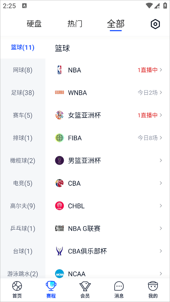 4、点击全部可以直接看到比赛类型、赛事名称进行挑选观看