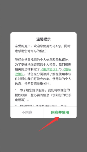 1、首次启动应用时,系统会显示用户协议和隐私政策,阅读后点击同意按钮进入主界面。