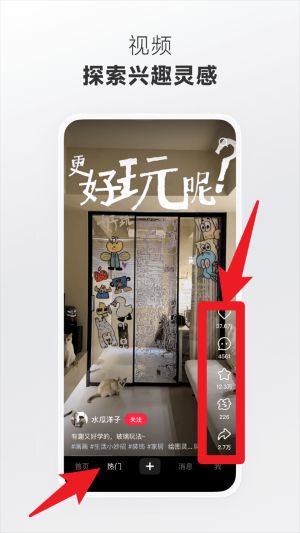 3、切换至“热门”视频,浏览视频内容时,右侧红框为点赞、收藏、评论与分享等互动按钮。