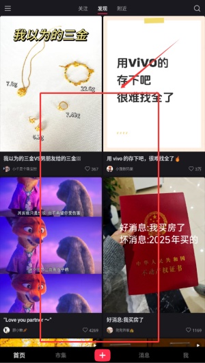 1、打开首页,点击“发现”页签可浏览多元内容,红框内标签可切换推荐、图集、短剧等类别。