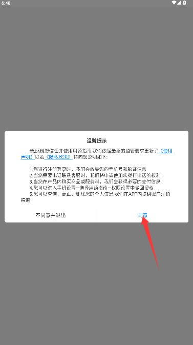 1、首次使用需阅读使用声明和隐私政策,确认无误后点击同意按钮进入应用。