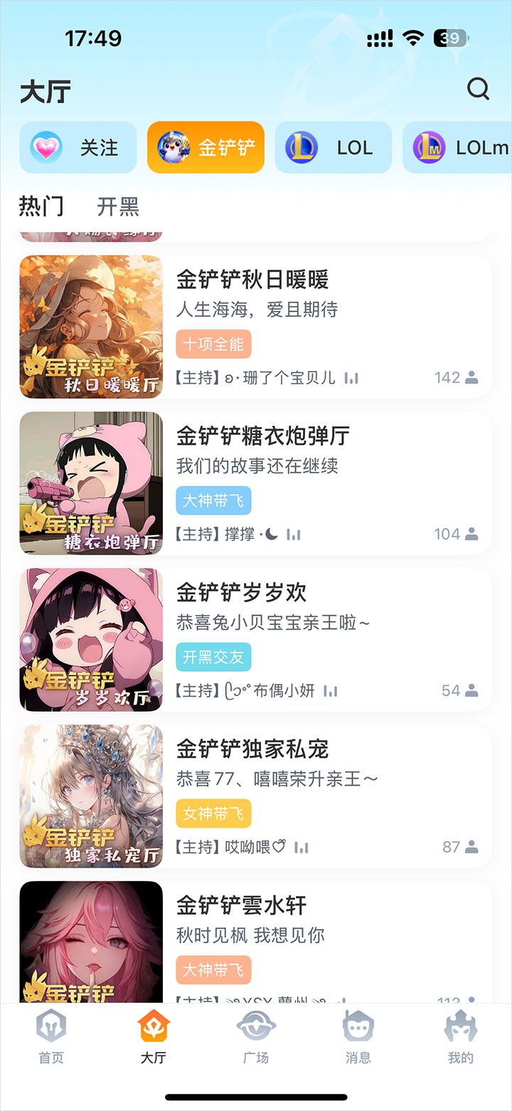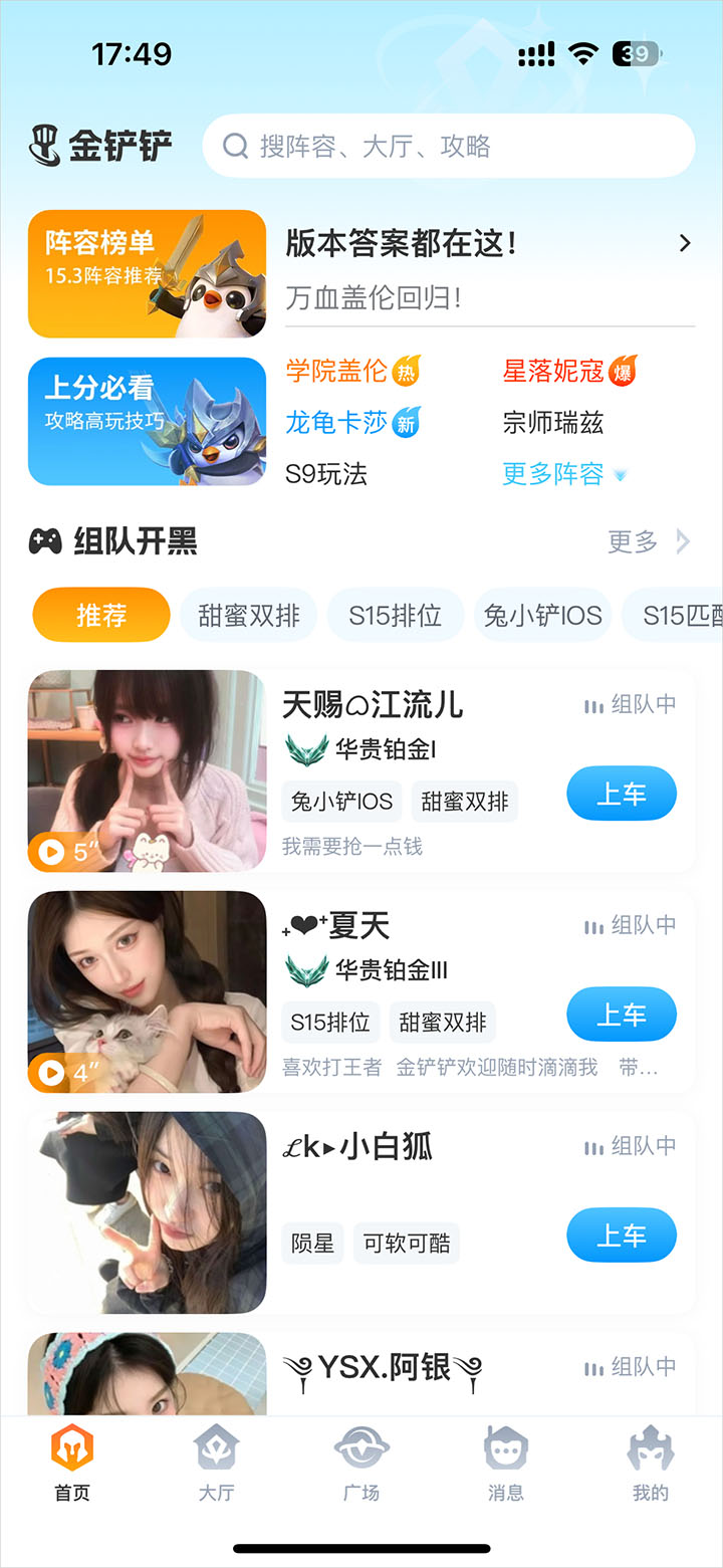 1、打开软件可以查看金铲铲的阵容推荐及组队开黑