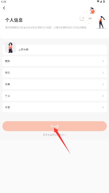 3、完善个人资料信息,上传头像并填写昵称性别身高体重等基础数据后提交。