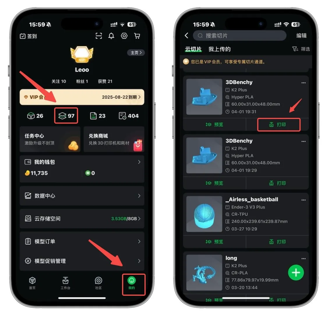 在创想云APP中,点击“我的”-“打印文件”-“云切片”,选择对应切片好的模型点击“打印”即可发送打印任务。