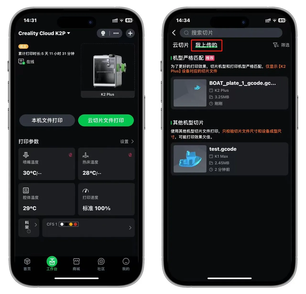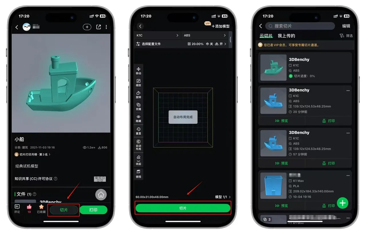 3、在线云切片:创想云app支持手机APP云切片,无需下载文件;3MF文件直接打印,简化流程。