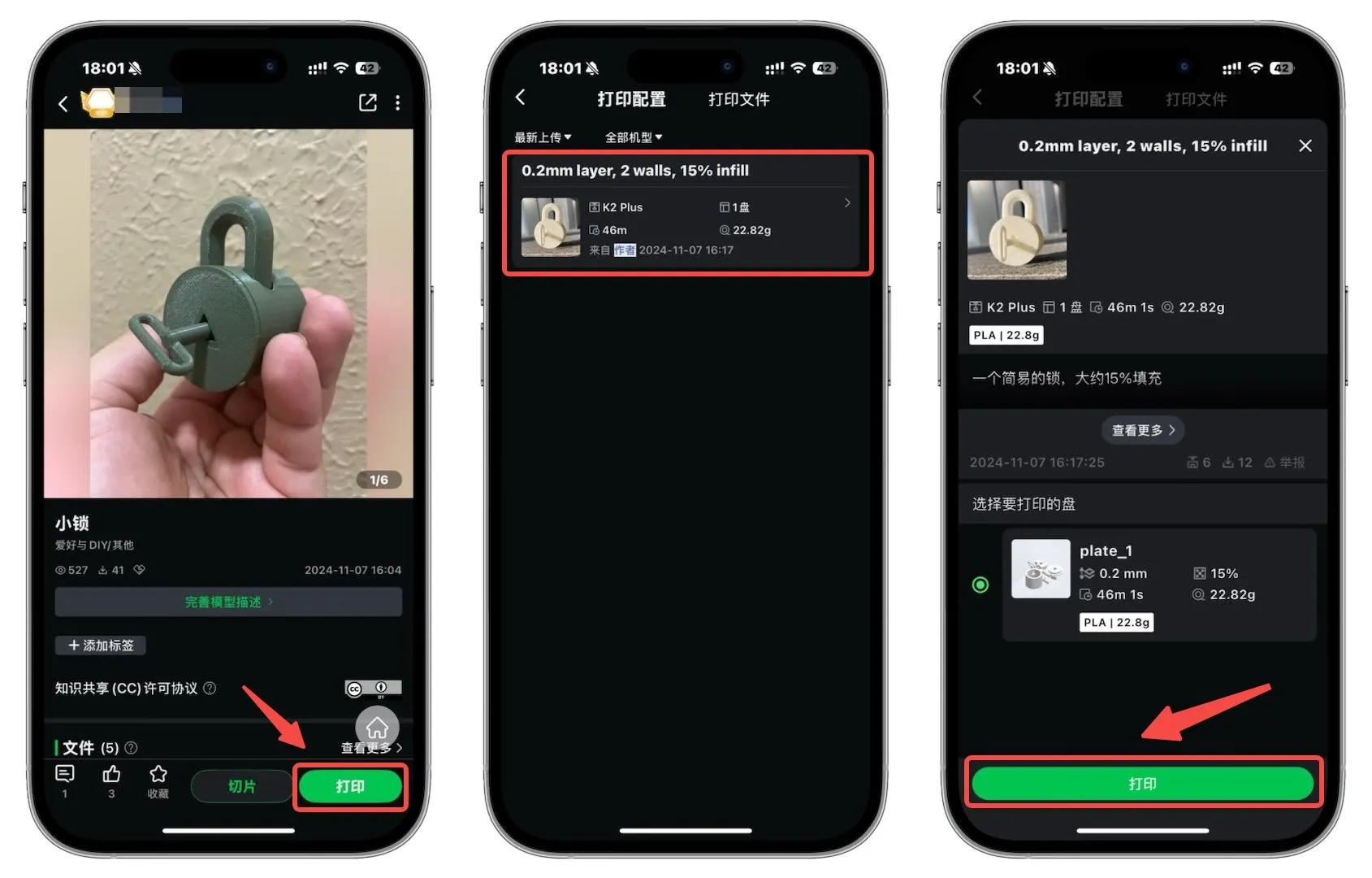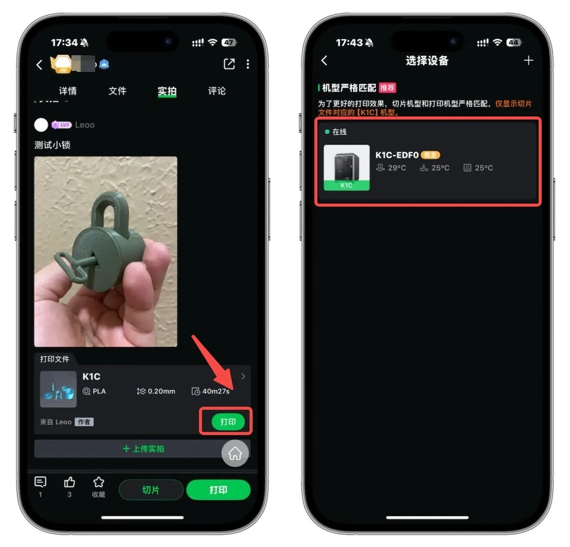 打开APP,在一个包含打印文件的模型详情页下点击“打印”按钮,随后选择对应的打印机即可发送该项打印任务。