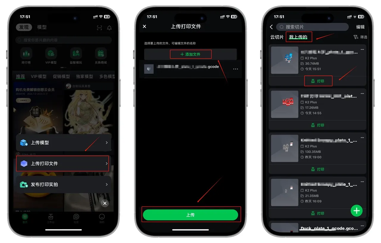 打开创想云APP,点击首页右下角的“+”号,随后点击“上传打印文件”,点击“添加文件”将本地G-code上传,完成上传后即可在“我上传的”中找到对应的模型文件,最后点击“打印”即可发送打印任务。