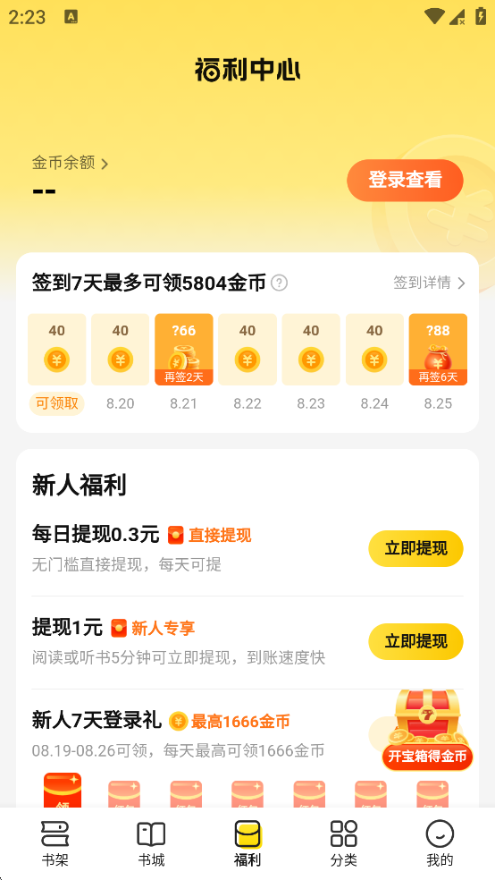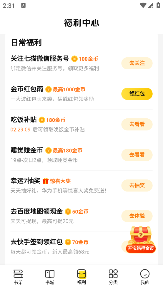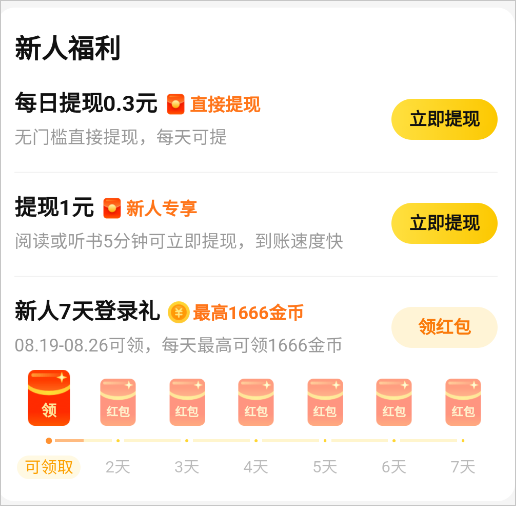 通过丰富的福利任务赚取金币,金币可以快速提现!新人福利、每日签到、阅读小说可以快速获取大量金币!看小说赚零花,金币福利等你来拿!