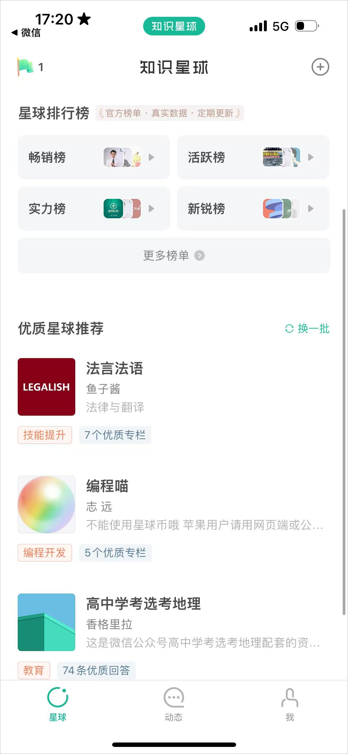 1、打开知识星球app首先可以看到星球排行榜和优质星球推荐,可以随意挑选感兴趣的星球进行加入
