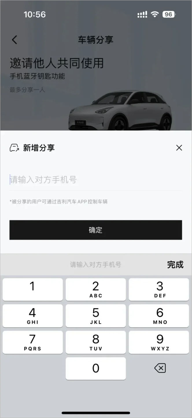 4、输入你要分享用户的手机号,注意对方一定要用这个号码注册吉利银河app