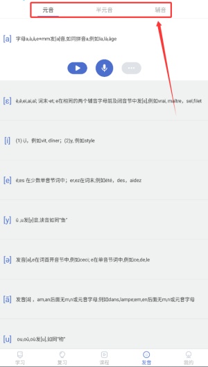 3、进入课程目录后,点选“辅音”或具体发音分类,进入对应学习单元。