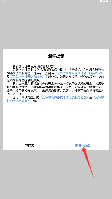 1、打开应用后仔细阅读用户协议和隐私政策,确认后点击同意并继续按钮进入。