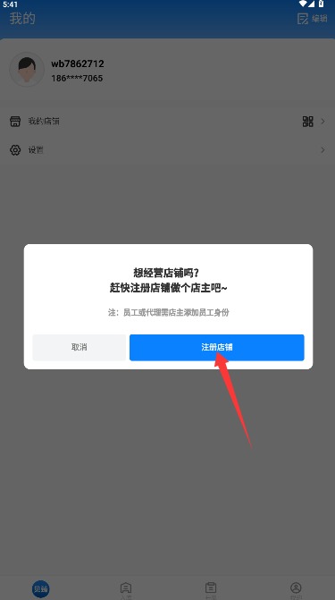 3、进入应用主界面后,找到并点击"注册店铺"功能按钮进入商家资料填写页面。
