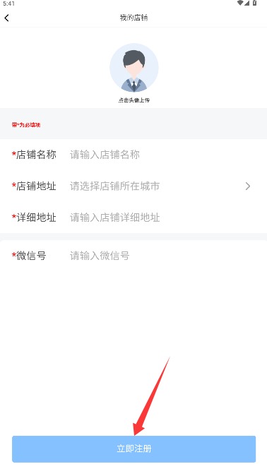 4、按要求上传店铺头像,填写店铺名称、详细地址及联系方式后提交注册申请。