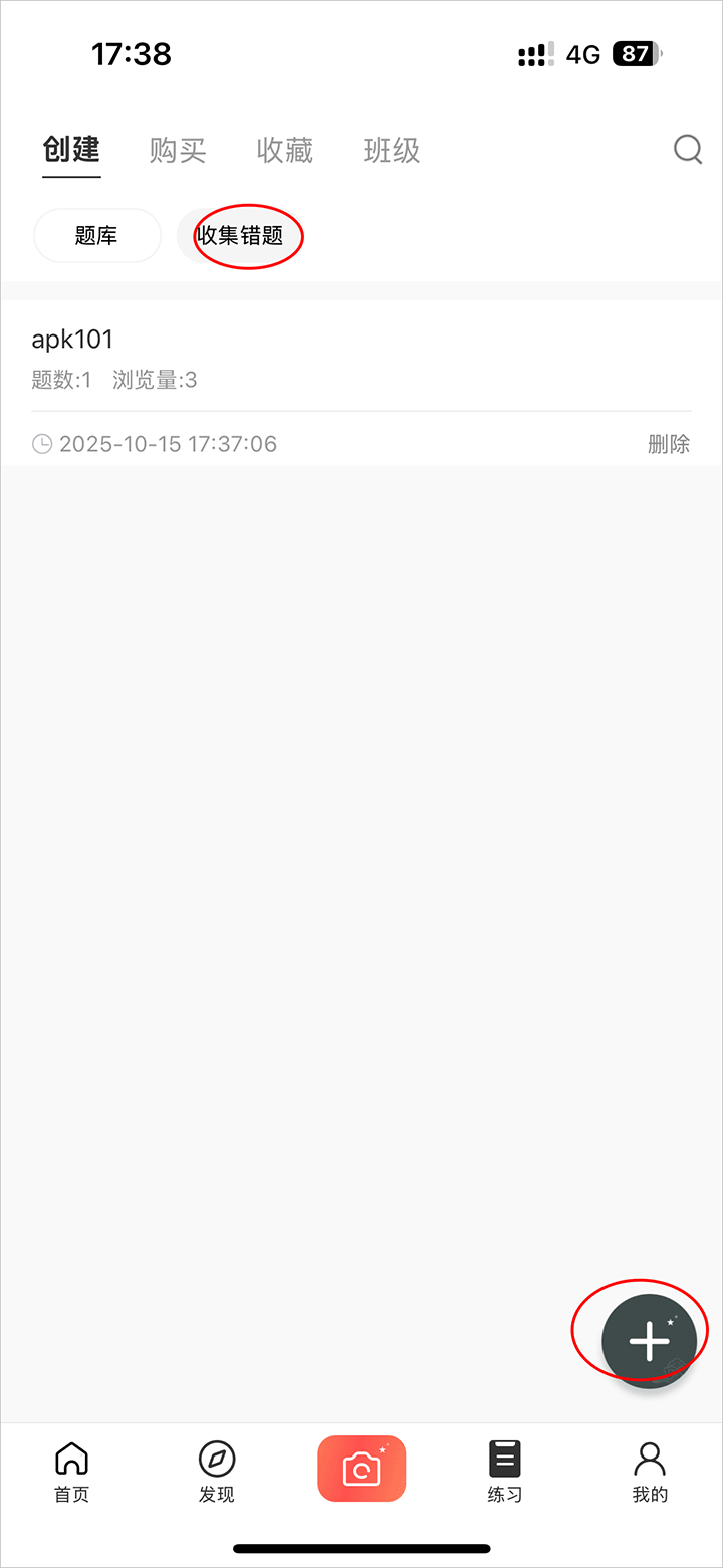 2、进入练习页面选择收集错题页面点击右下角的【+】图标